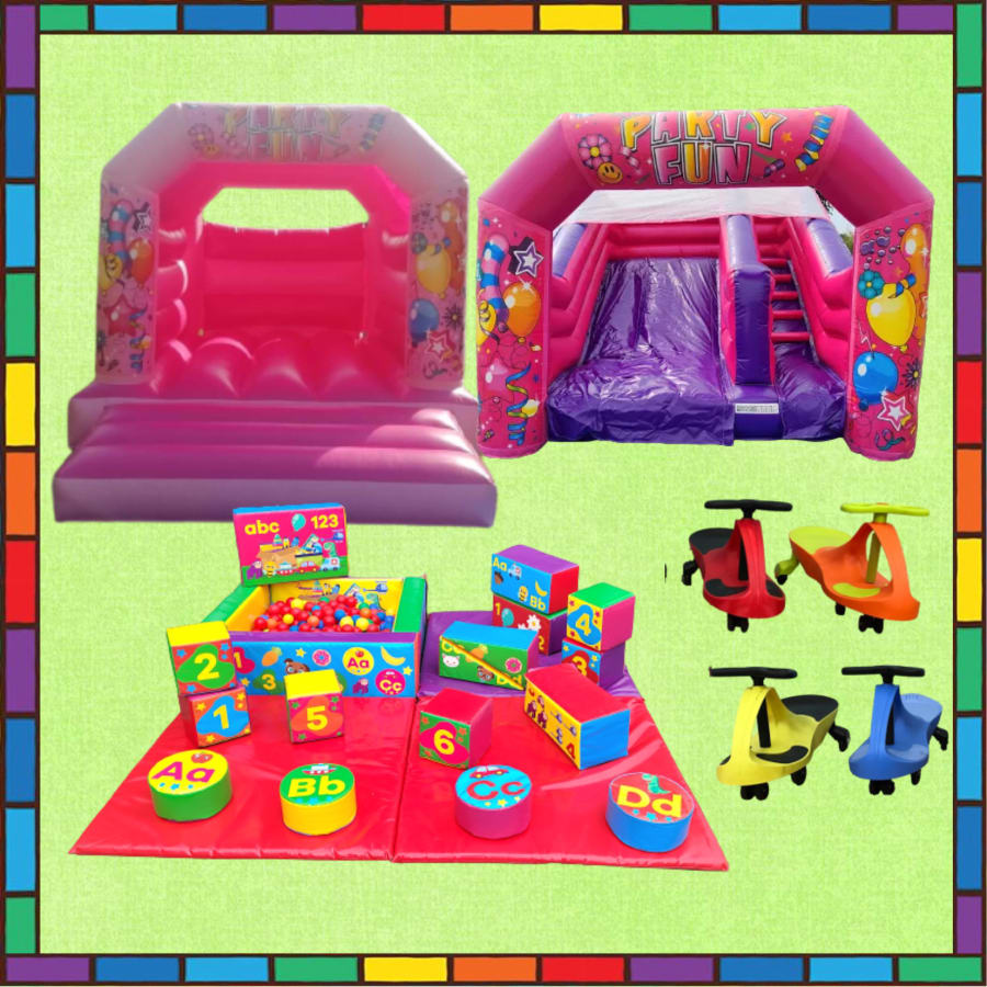Pink and sweet, why not hire this massive pink extreme party package, it’s simply the best and biggest pink party around. With the Pink Celebration Bouncy Castle along with the stunning Celebration Inflatable Slide Pink & Purple to complete the inflatables in this package. To top the package off, you also get the Classic Soft Play with padded mats and Classic Ball Pit. Finally to top this huge package off, you get the super fun didicars to help children wizz around.