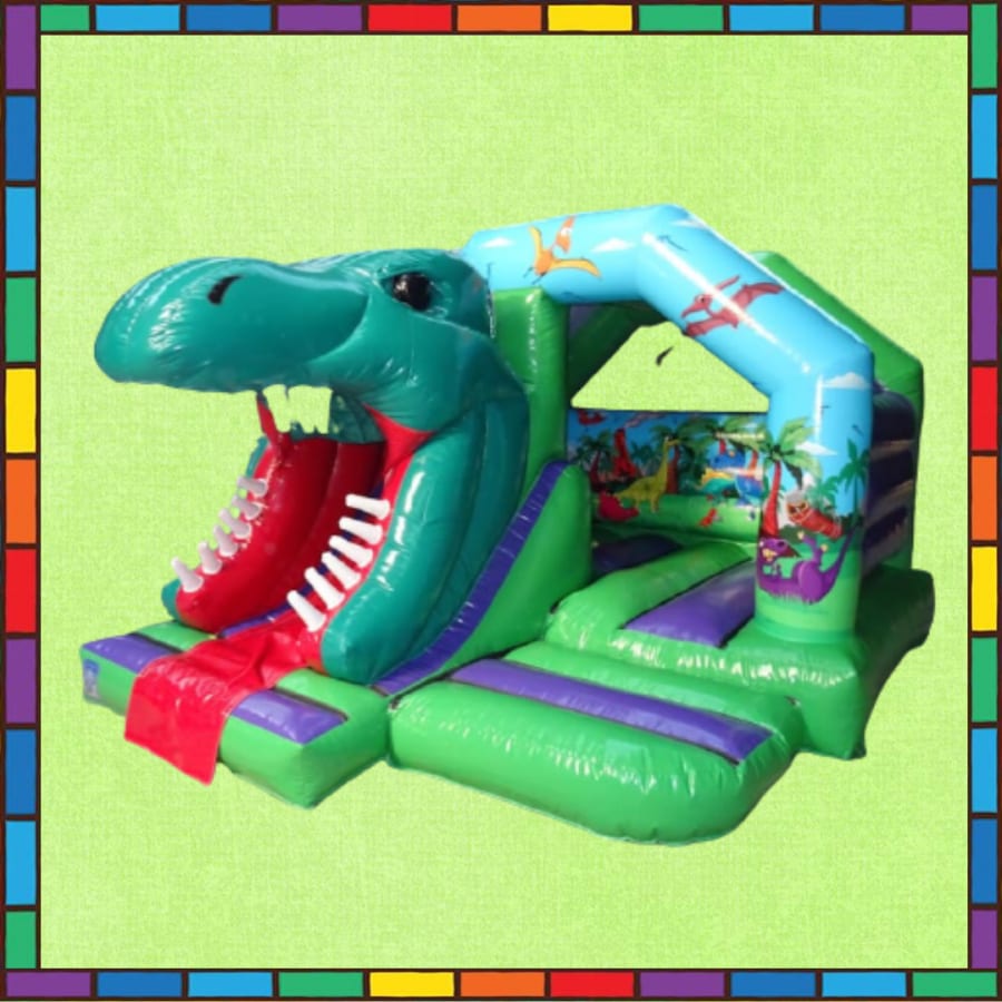 This is the new bouncy castle design. The slide on the front has been made to look like the face of a dinosaur. This looks like the t-rex everyones favourite dinosaur. The children can bounce in the large bouncing area before climbing up and sliding though the mouth of the dinosaur.
