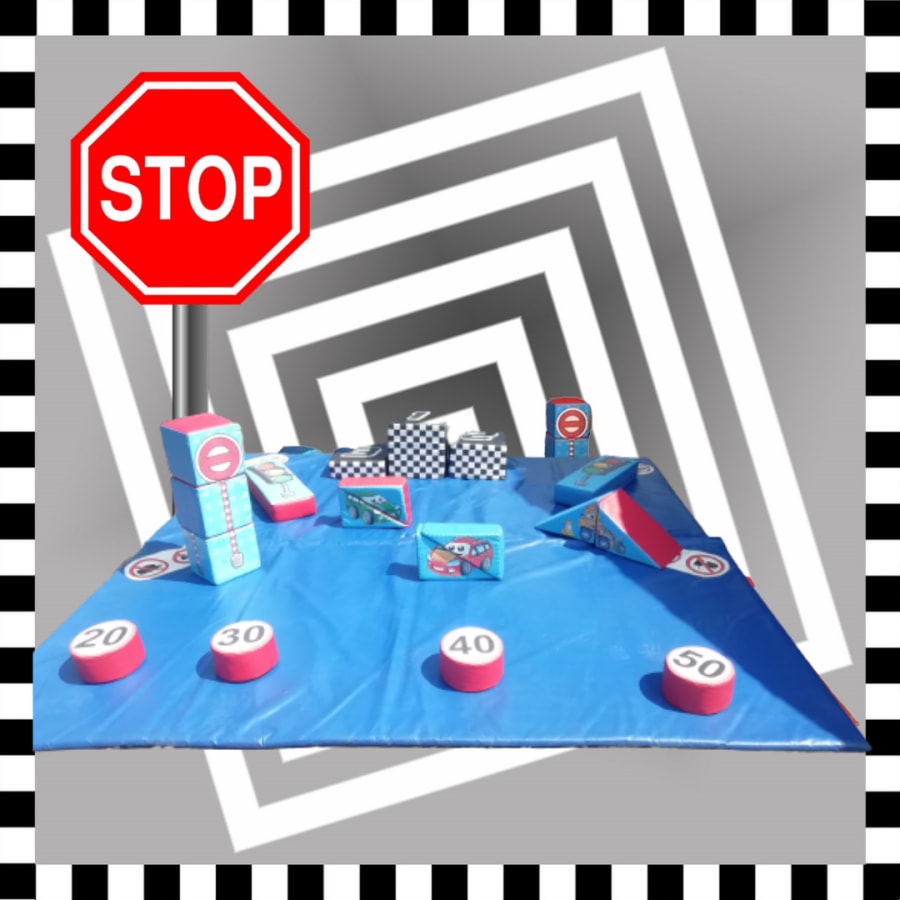 If you have a party coming up, maybe a fun day, or charity event, why not hire this delightful car/traffic termed soft play, with it's checked blocks for first, second and third place, its a real winner with toddlers who love pushing their cars around the house. Take advantage of the double rocker included within this soft play set. Don't forget to set the speeds and stop at the soft play traffic lights.
