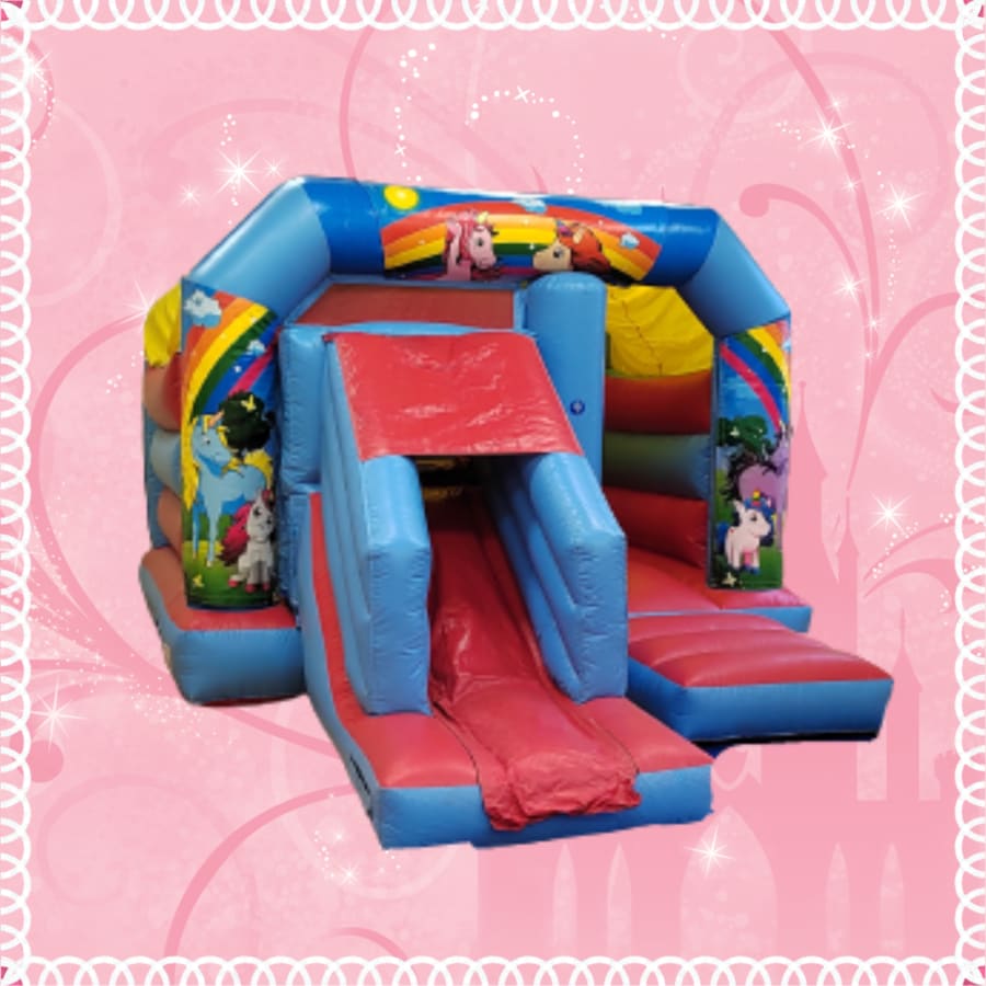 Everyones favourite mythical creature the unicorn is loved by children. This is the unicorn theme bouncy castle with a slide on the front. The blue and red castle compliments the unicorn theme artwork.