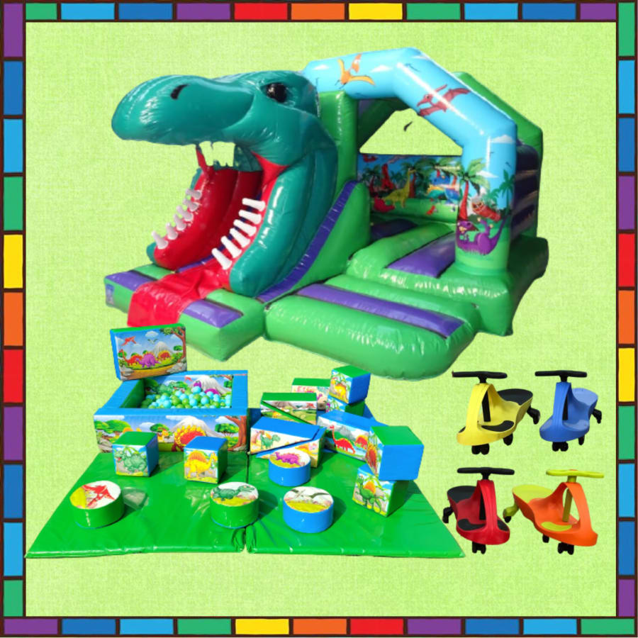This is the best Dinosaur package for the best party! With our 3D Dinosaur Bouncy Castle, Dinosaur Soft Play Set, Dinosaur Ball Pit and Didicars x 4. Not only that but you have the option to add Dinosaur Peek-A-Boo to the package (extra £15) just tick the box on the booking form