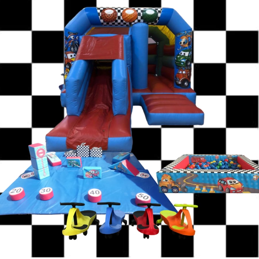 Broom broom! Is your child a car lover? Then this is the best party package for you. They will be so excited to see the Traffic Combi Castle Blue & Red, Car Soft Play Set, Car Ball Pit and Didicars x 4 at their birthday party.