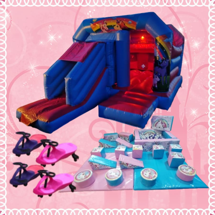 Bring a burst of color, music and safe active play to your child's special day with our Disco Unicorn Party Package. This enchanting set combines a Unicorn Disco Bouncy Castle, unicorn softplay and a unicorn ball pit, as well as 4 Didi Cars to create a lively, themed experience perfect for unicorn birthday party celebrations.